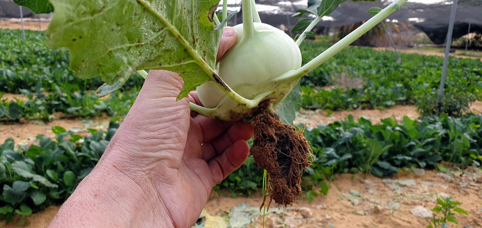 Dinsdag 9 januari. vandaag geen tomaten, maar buiten op het veld Koolrabi's trekken, snoeien en in dozen en zodoende klaar voor de veiling maken.