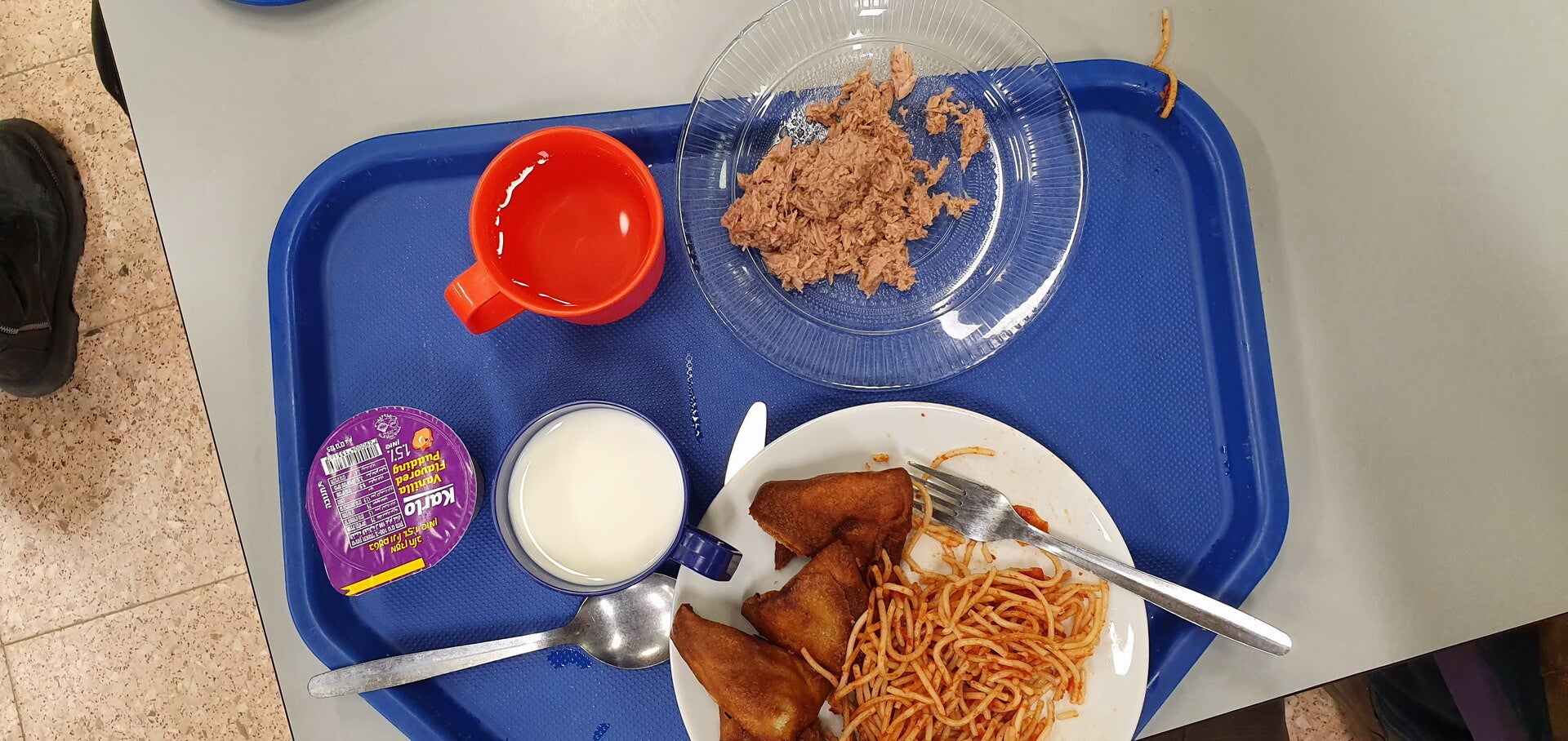 Maandag 8 januari. Vandaag de eerste dag dat we aan het werk gaan. We werden om 7 uur opgehaald, en het ontbijt ging mee in een krat, en, toetjes!